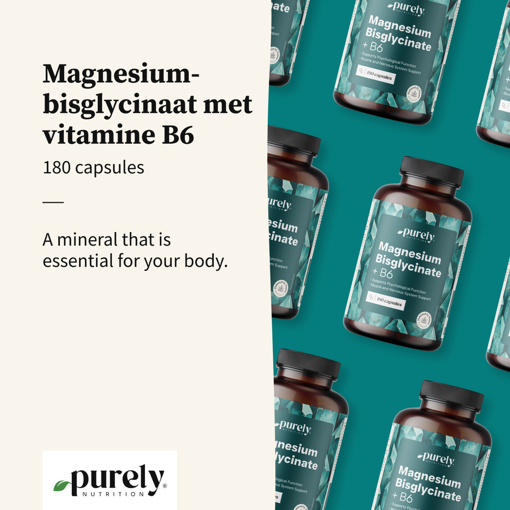 Ingrediënten: magnesiumbisglycinaat, veganistische capsulehuls, microkristallijne cellulose (vulstof), magnesiumstearaat (antiklontermiddel), pyridoxinehydrochloride (vitamine B6)