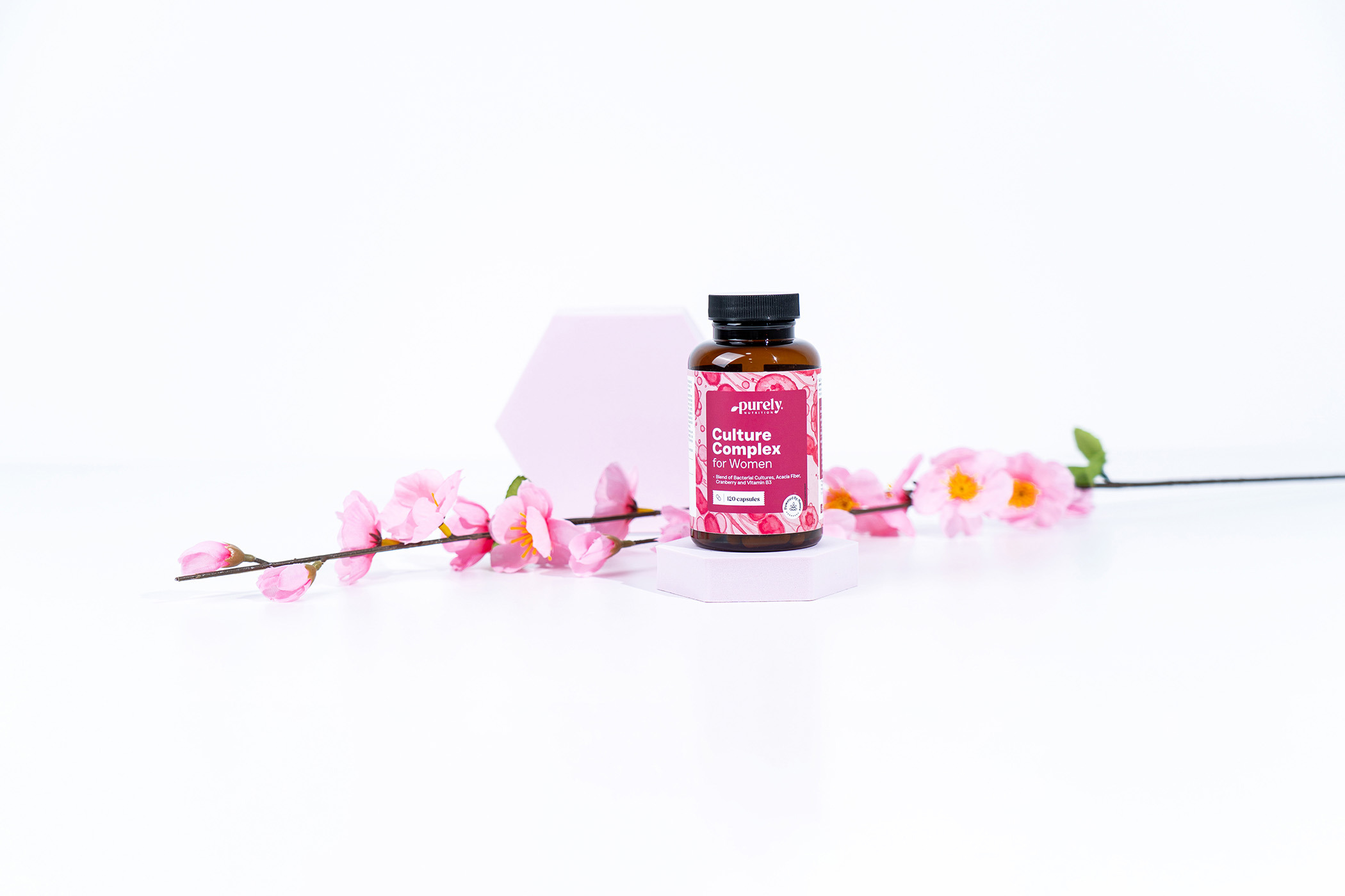 Cranberry-extract (Vaccinium macrocarpon) en vitamine B3 vullen het effect van de bacterieculturen uitstekend aan en ronden de formule af tot een evenwichtige en lichaamsvriendelijke ondersteuning.